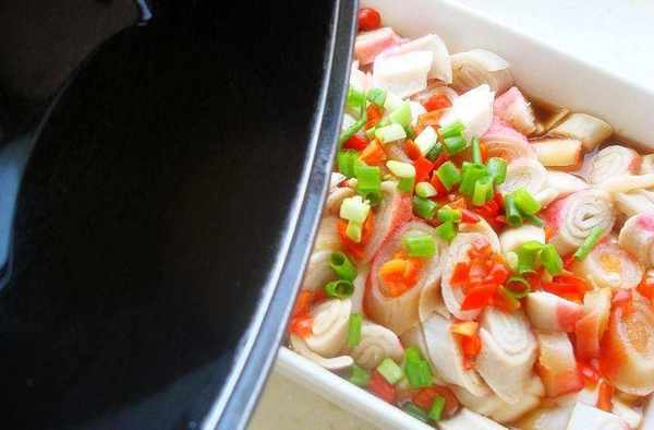 7、時間到後小心燙著,因為電蒸鍋實,撒上香蔥末或者紅辣椒丁點綴,澆上熱油,激發出香味,這樣味道香濃又鮮美好吃。如果想偷懶,可以滴幾滴香油也不錯。