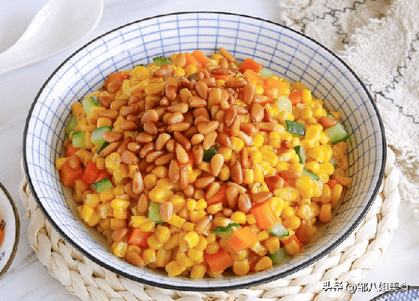 將新鮮玉米去皮並沖洗幹凈。胡蘿卜丁、黃瓜丁和松子丁就做好瞭。
