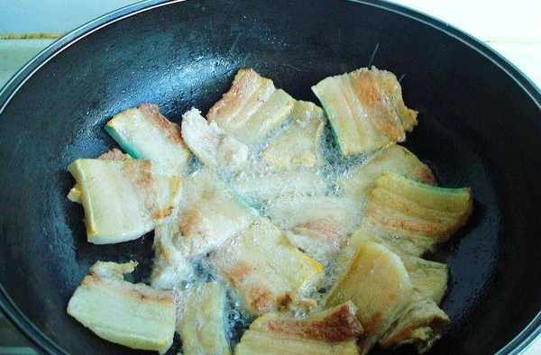 3、把炒鍋燒的熱熱的,下豬肥肉,中小火炒出油脂出香味以後