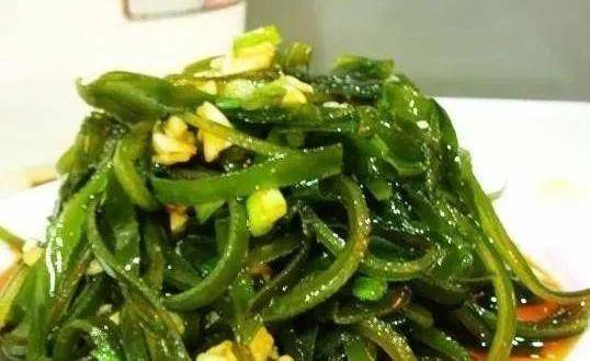 2.海帶整條清洗幹凈後卷起來切成細絲進開水裡焯一下撈出濾幹水。