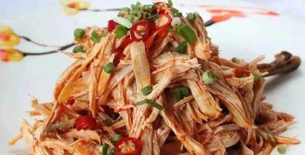 4.把涼透瞭的雞用手撕成小條,加木耳,倒入調味汁拌勻。