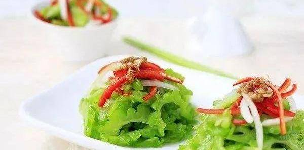 2.將苦瓜條加辣椒絲和精鹽後,控出水分,然後放涼開水中浸涼撈出,放人醬油、豆瓣醬、蒜泥和熟油拌勻即可。