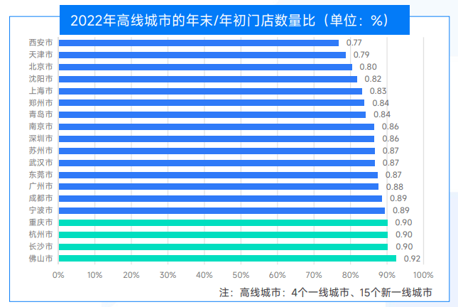 不僅如此,在2022年全國餐飲門店大幅縮減的背景下,杭州年末/年初門店數量比達到90%,在19個高線城市(含一線和新一線城市)中,與長沙、重慶並列第二位,僅次於佛山,這也從側面反映出杭州餐飲業態的競爭力。