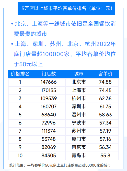 另外,根據上述《2022年餐飲行業洞察報告》,杭州門店平均客單價為62.38元,高居全國第三位,僅次於北京(74.88元)和上海(74.45元)。食品產業分析師朱丹蓬向城叔分析指出,杭幫菜比較精細,對食材和工藝都要求較高,所以價格比較高。再加上房租租金等各方面因素的影響,就造成其餐飲收入較高。