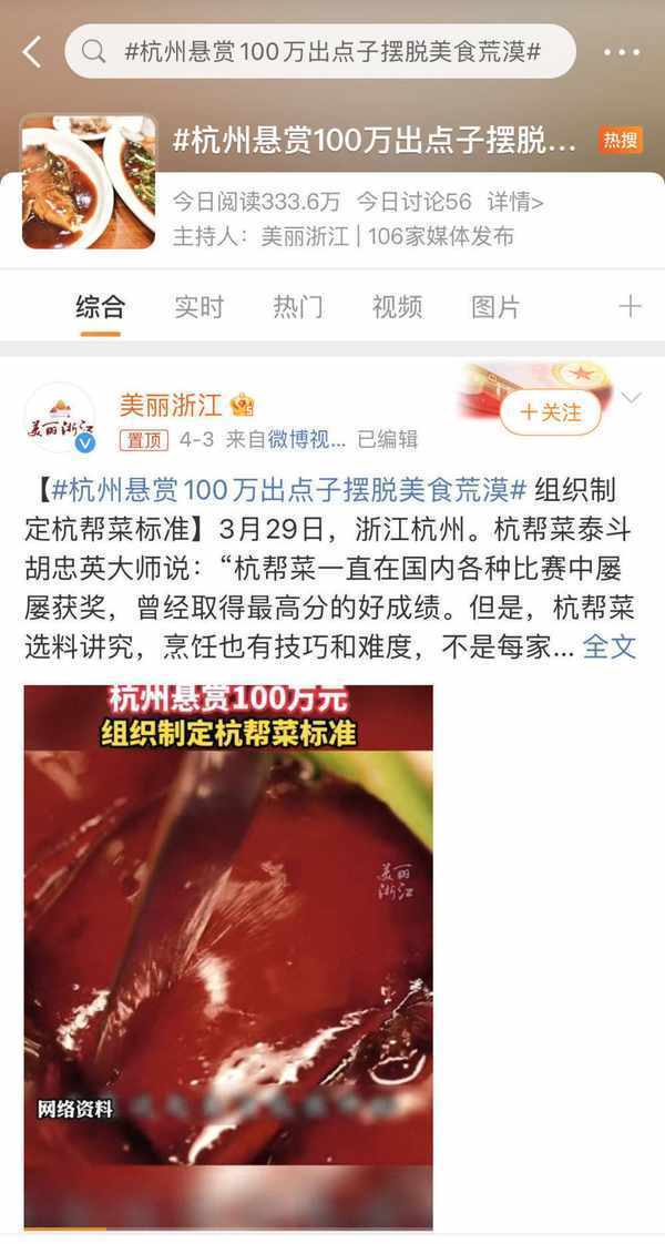 不久前,一則“杭州懸賞100萬出點子擺脫美食荒漠”的新聞沖上熱搜,閱讀次數已達到3.7億次。不過,杭州市商務局相關負責人後向媒體回應,該說法“系自媒體不明就裡,斷章取義,以訛傳訛”。