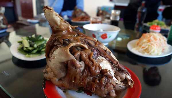 3.吃羊頭的關鍵還得配一個關鍵性的蘸汁,石臼裡面加入脫皮的大蒜加點鹽,搗成碎泥,加點涼白開、生抽,山西老陳醋,充分攪勻,蘸料做好,配上羊頭一起上桌,蘸著吃特別美味。