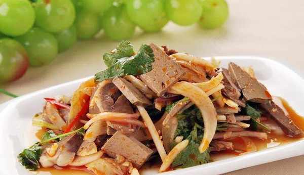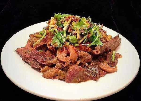 3.另鍋加清水,下入頭蹄雜碎,加薑、蔥、五香粉同煮約2小時至肉,撈出晾冷,羊頭去骨,與羊肚、羊腸、羊肺切成薄片,在盆中加青花椒、煳海椒面、蔥節、香菜節、味精、鹽、蒜水拌勻裝盤即成。