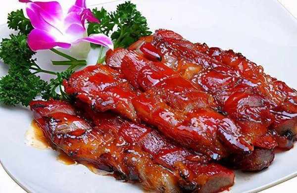 2. 用叉燒環逐條穿上,入爐燒烤25分鐘至30分鐘(傢庭用烘盤盛起放入烤爐烤制,滴出清油便熟,出爐後淋上糖漿即成。