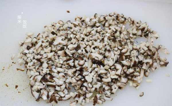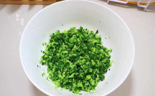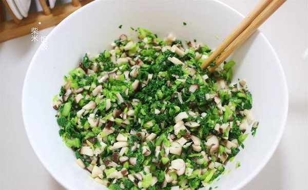 4,接著把青菜切碎,擠幹裡面的水分。香菇擠幹水分,也切碎。