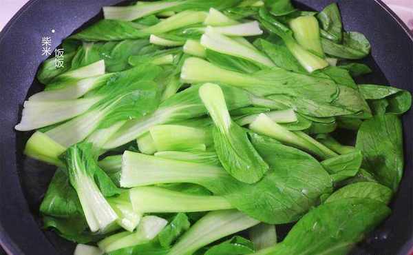 2,燒一鍋開水,加1勺鹽和少許食用油,把青菜放進來,大火焯燙半分鐘撈出。用涼水淘一遍。