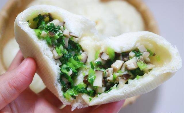 9,水開計時,大火蒸10分鐘,關火燜2分鐘即可出鍋。白白胖胖,超級柔軟的香菇青菜包就好瞭。掰開看一下,裡面的青菜顏色翠綠,味道也非常鮮美。大傢快試試吧。