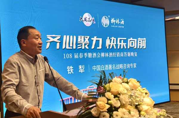 三秦都市報—三秦網訊(記者江波)4月8日晚,中國白酒著名戰略咨詢專傢鐵犁先生應柳林酒之邀,參加在成都舉行的“齊心聚力 快樂向前”第108 屆春季糖酒會柳林酒經銷商答謝晚宴。晚宴上,他發表熱情洋溢的講話,給在現場來自全國各地的經銷商朋友講:“未來白酒的機遇在鳳香,我非常堅定地看好柳林酒!”
