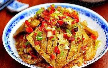 1.將白豆幹雙面割上斜花刀,紅椒、香蔥、大蒜剁碎備用;平底鍋燒熱,放入2大匙油燒熱,將豆腐放入用中火煎制
