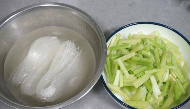 芹菜縱剖兩刀,切寸段,粉絲涼水泡軟剪短。