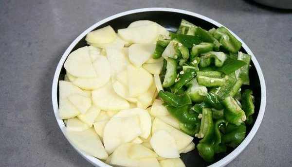 土豆洗凈削皮,切片,辣椒去蒂去籽切大塊,備用。