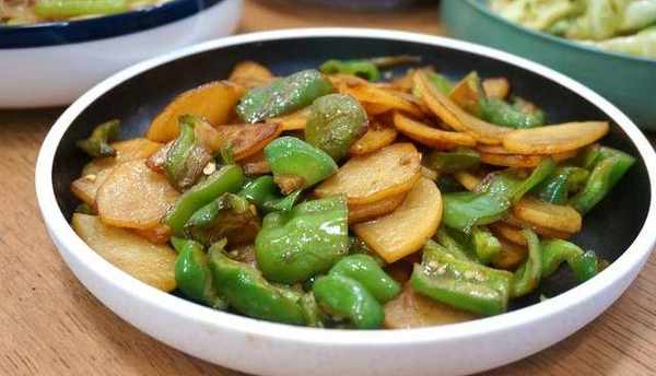 這盤辣椒土豆片,雖說是素菜,但是很下飯,炒鍋放油,蔥花煸香,土豆片放入鍋中煸炒,直到出現焦邊變透明狀,將辣椒倒入鍋中翻炒,倒入醬油,撒鹽調味,翻炒均勻出鍋。