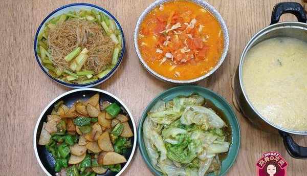 今天晚餐比較素,就隻有一個帶肉的。晚餐講究吃好,但並不是吃得大魚大肉越多越好。晚間活動量和時間較短,還是要以好消化為主。蠔油生菜、芹菜粉絲、辣椒土豆片,唯一葷的就是西紅柿肉片,既當菜又可當湯。還有一鍋蘿卜絲玉米渣兒稀粥。