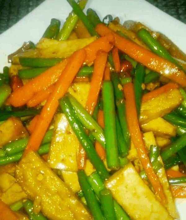 鍋中放油,放入幹辣椒,香幹片大火翻炒出香味。之後倒入焯好水的蒜苔和胡蘿卜,放入鹽,蒸魚豉油翻炒至蒜苔熟即可。這樣一道傢常的香幹炒蒜苔就制作完成瞭,快來嘗試一下吧。