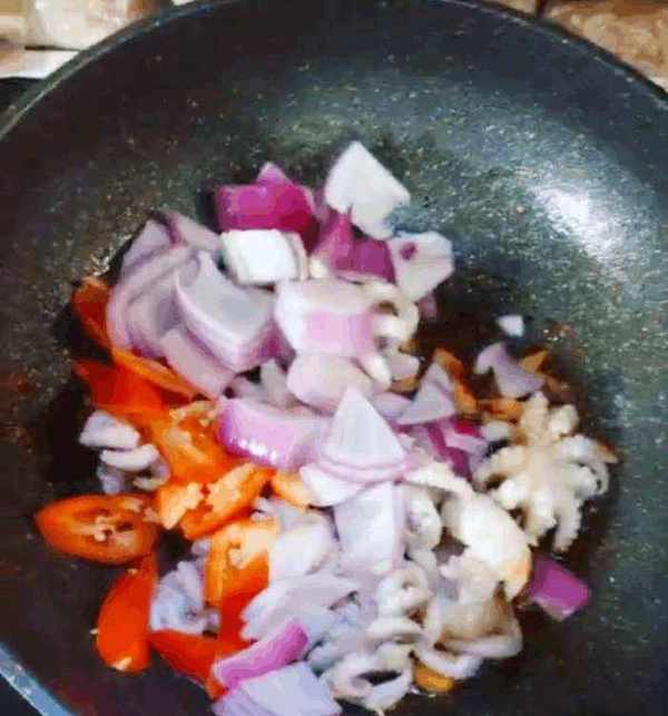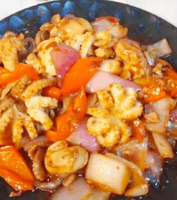 把八爪魚冷水下鍋燙至斷生去腥,之後撈出來過冷水,確保八爪魚的口感脆。泡五分鐘後撈出晾幹水分,熱鍋放油把薑,蒜,豆瓣醬爆香。之後把八爪魚放下去炒香,隨後放入洋蔥,紅椒,放入鹽調味。