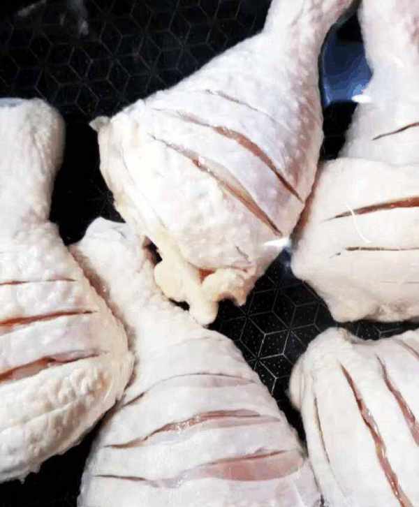 把雞腿劃上花刀,這樣方便入味。把雞腿冷水下鍋,煮出血水,記得在裡面加點料酒去腥。煮至雞腿發白,看不見紅色的肉質即可撈出來瞭。