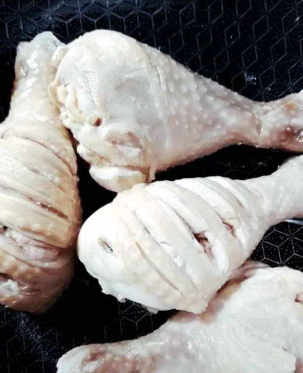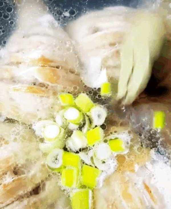 準備一盆冷水,把雞腿放裡面。這樣是讓雞腿的口感更彈,皮也脆。浸泡5分鐘後撈出,拿溫水洗凈雞腿,多洗幾遍。
