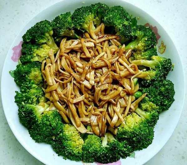 西藍花杏鮑菇絲:西藍花掰小朵,用淡鹽水泡一會兒,蒜切粒,油微熱放入蒜粒炒香,放西藍花,下耗油,少加點水,(因西藍花直接炒沒有水焯),炒熟盛盤,在盤中花沖外擺一圈。杏鮑菇切絲,油微熱下杏鮑菇絲,放耗油,稍加點兒老抽上色,最後加點兒水淀粉,盛入盤中間。一道鮮美的西蘭花杏鮑菇絲就做好瞭。