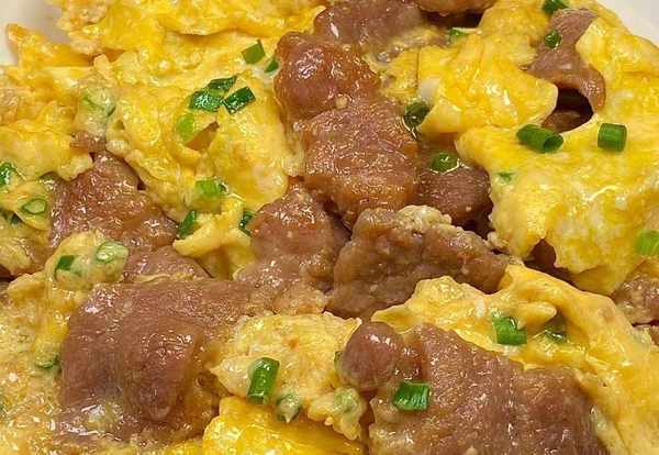 4、再次起鍋燒油,油熱後放入牛肉雞蛋液煎一下,煮至稍微定型後,用鍋鏟慢慢推動,炒熟後炒散,就可以出鍋裝盤開吃瞭。