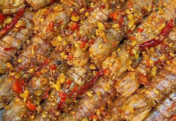準備食材:皮皮蝦,小米辣,幹辣椒,辣椒粉,白芝麻,花椒,蒜末,薑末。