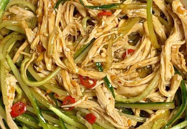 3、雞胸肉放涼後撕成絲放入碗中,黃瓜清洗幹凈後刨成絲放入雞胸肉中,再倒入提前備好的涼拌醬汁,抓拌均勻即可上桌開吃。