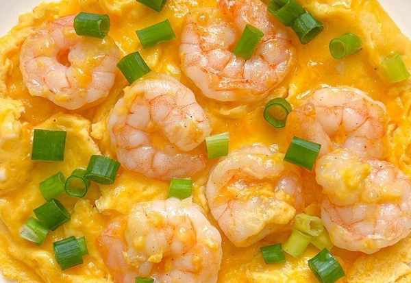 3、起鍋燒油,油熱後倒入蝦仁雞蛋液,稍微定型之後,用鍋鏟一點點往裡推,煮熟後即可出鍋裝盤,撒上蔥花即可上桌開吃。