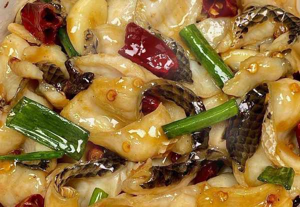 2、起鍋燒油,油熱後放入蒜片、幹辣椒、花椒翻炒出香味,再放入醃制好的黑魚片翻炒一會兒,炒至變色後加入生抽、食鹽和白糖調味,快速翻炒均勻入味。