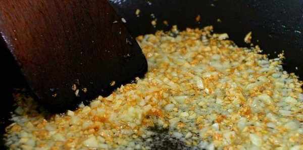 3、鍋中倒一些油,把一部分蒜末倒進去,全程用小火慢熬。
