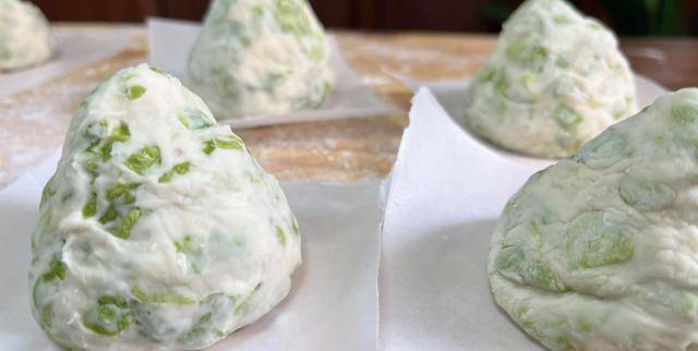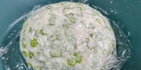 4、隨後把薺菜末倒進來跟面團一起揉搓,讓它們充分融合。