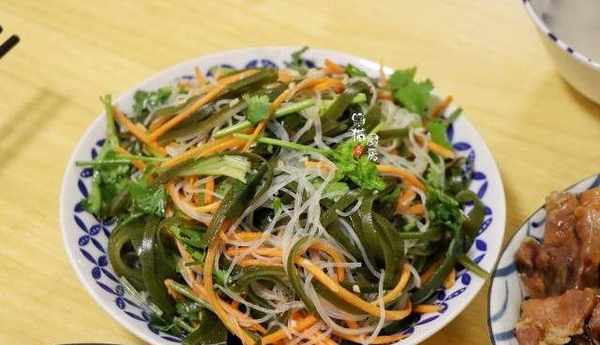 都說我傢餐桌的涼拌菜是必定出現的菜式,涼拌菜清爽解油膩,上面的蒸扣肉正好可以用這一盤【涼拌三絲】解解膩,海帶絲、粉絲、胡蘿卜絲汆燙過,加點香菜蒜末,油鹽醬醋簡單拌一拌,開胃!