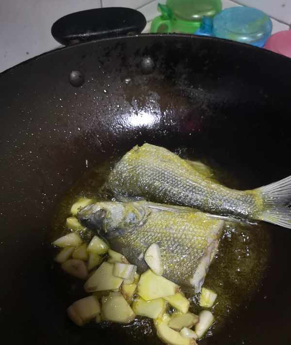 做菜第二步:鍋中放菜籽油,燒熱後放大蒜生薑片,炸香後放翹嘴魚入鍋煎到金黃。