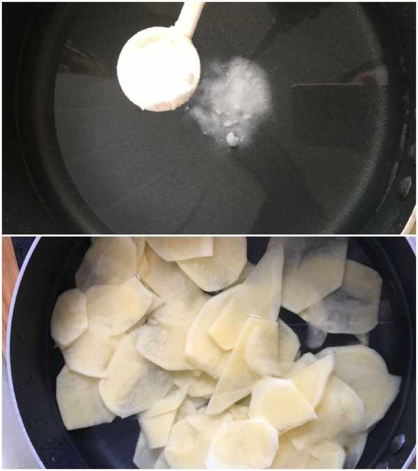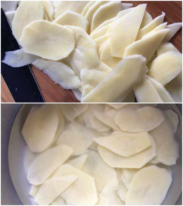 1.把土豆切成薄片用水泡10分鐘去除淀粉,撈出。