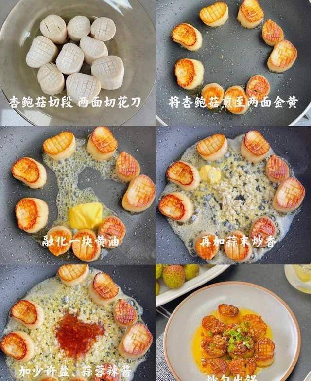 杏鮑菇切成厚度不相上下的段,兩面切上十字花刀,噴少許油在平底鍋,放入杏鮑菇煎至2面金黃,再加入1小塊黃油,黃油融化得差不多的時候撒上蒜末,讓蒜香和黃油香味充分混合在一起,後面再加少許蒜蓉辣醬蠔油,豉油炒勻撒上小蔥花出鍋即可開吃,其實後面這步加調料我個人覺得不用瞭,越少的調料,越能吃得出來原汁原味。