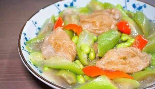3、鍋裡倒油,先煸炒絲瓜,待絲瓜稍稍變軟,再倒入油面筋和毛豆煸炒,然後加鹽和紅椒煸炒,最後勾個芡就能出鍋。
