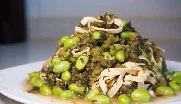 1、千張可以讓店傢幫忙切絲,拿回來焯水。咸菜買回傢後稍微沖洗一下,切成碎末。毛豆剝好洗凈,過熱水焯熟。