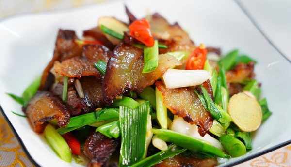 第五步:首先把鍋燒熱,燒熱以後,加入適量的冷油,油溫燒到7成熱的時候,將熱油倒出這一步是為瞭滑鍋,然後再加入適量的冷油,再把切好的五花肉倒入鍋中,開中小火爆炒一分鐘。把肉炒成燈盞窩之後,再加入幾粒豆豉,開小火,將豆豉炒香。
