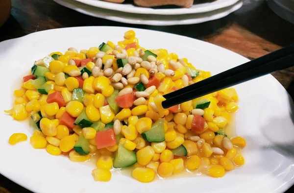 第一步:準備適量的胡蘿卜,清洗幹凈後去除外皮,再改刀切成丁。準備適量的黃瓜,清洗幹凈後改刀切成丁,再準備適量的玉米,將玉米放入鍋中焯一下水,焯水之後撈出,放到盤中備用。再下入胡蘿卜和黃瓜焯一下水。