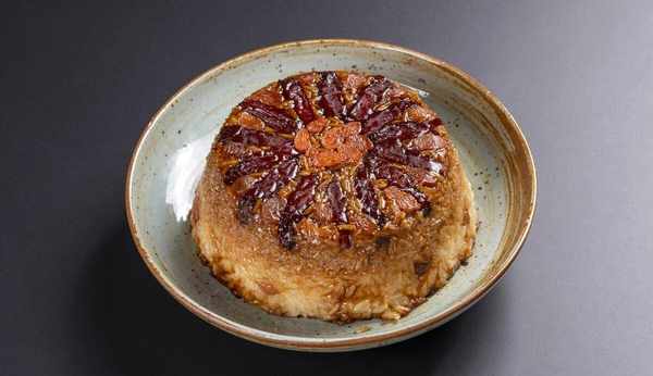 第三步:找一個耐高溫的小碗,底部刷上一層食用油,鋪上紅棗,葡萄幹,枸杞等等。這些食材主要是來裝扮頂部的。