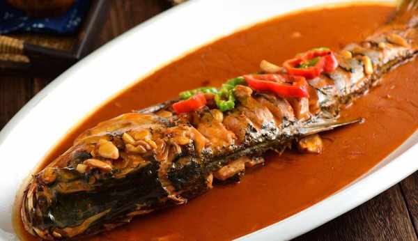 第九步:時間到瞭以後用漏勺把鍋中,大料和殘渣撈出來,再開大火,將湯汁收一下,加入適量的水淀粉勾芡,再加入適量的明油,加明油能讓湯汁的顏色更加鮮亮一點,把熬好的湯汁澆在魚身上,這樣一道美味的紅燒魚就做好瞭。