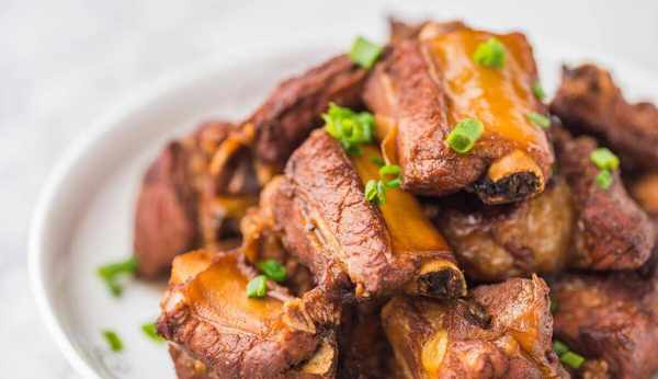 第六步:時間到瞭以後,加入一勺的食鹽入一下底味,加鹽的時候切記不可提前加,排骨將要煮熟的時候再加鹽調味,如果提前加鹽的話,很容易將排骨煮得比較柴一點,這樣影響口感。最後開大火將湯汁收得比較濃稠一點,一道美味的紅燒排骨就做好瞭。