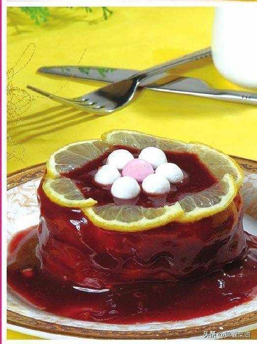 原料:豆沙 100 克,棗泥 100 克,山楂糕 150 克,雞蛋 5 個,牛奶 15 克,珍珠湯圓 12 個,檸檬片 15 克。