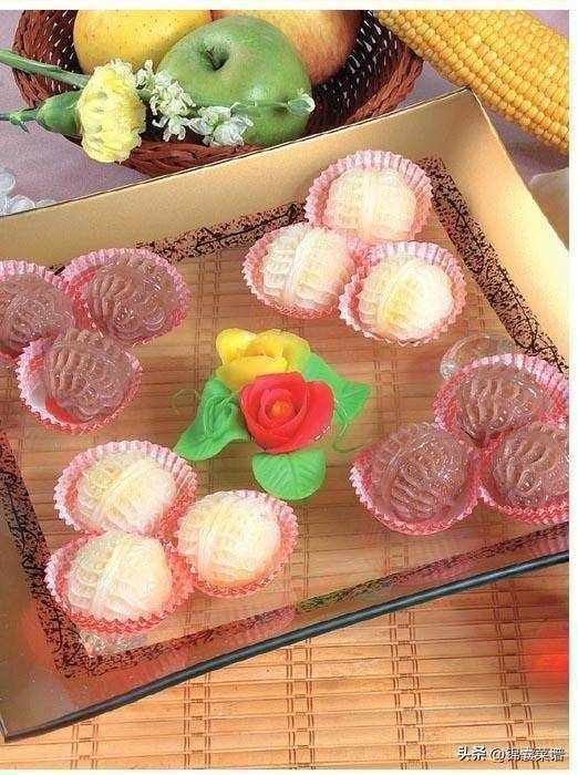 1 將澄面與糖粉、生粉和勻,用開水燙熟後,加豬油揉成白玉色面團。
