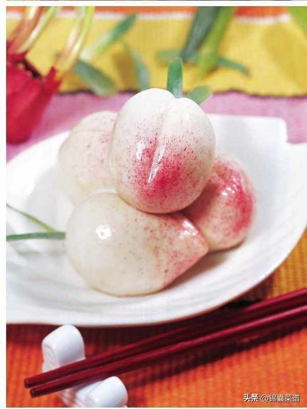 4 將生坯蒸 5 分鐘,在桃尖上刷噴紅曲水,刷上香油即成。