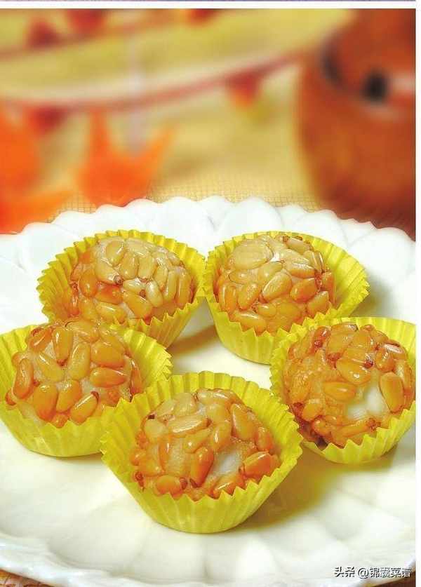 用料:水磨糯米粉 1000 克,白糖 200 克,豬油 100 克,澄粉 200 克,松子 500 克,色拉油(炸制用)2500 克,清水 350 毫升。