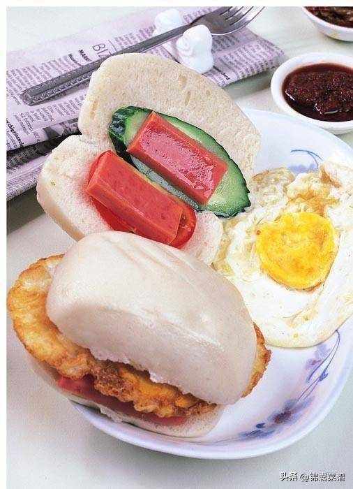 2 凈鍋置旺火上,放豬油,燒熱後打入雞蛋,煎至蛋白已熟、外皮老化、蛋黃還未完全熟時出鍋,撒上鹽、味精,淋上香油,將雞蛋、黃瓜片、火腿腸片、西紅柿片夾入饅頭內,立即上桌,跟碟配什錦菜、辣椒油各一小碟。