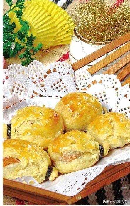 4 用面皮包入餡料,收口,在收口部分用黏上蛋黃液的紫菜絲捆紮,在表面用剪出小刺,在表面刷上蛋黃液,下入熱油鍋炸至表面呈金黃色,撈出裝盤。